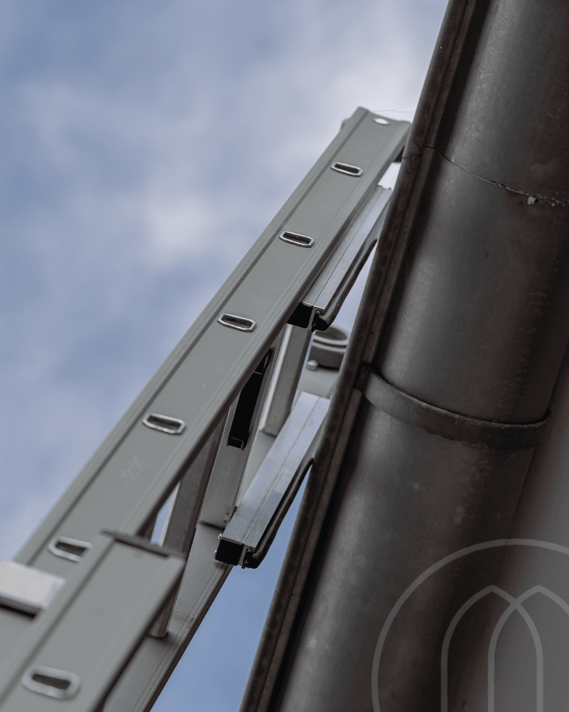 Ladders worden zorgvuldig tegen de gevel geplaatst, ons team draagt overschoenen en we gebruiken alleen de beste schoonmaakmaterialen.